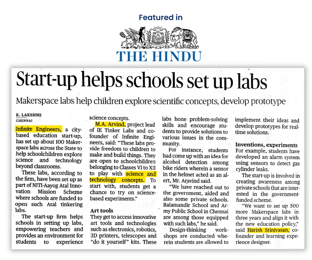 At Infinite Engineers, we are a passionate team of researchers, engineers, and educators dedicated to transforming schools into innovation hubs. Since 2013, our mission has been to empower young minds to become future-ready innovators, problem-solvers, and leaders. Think of us as your school’s R&D team—pioneering ideas and creating solutions that shape the builders of tomorrow.